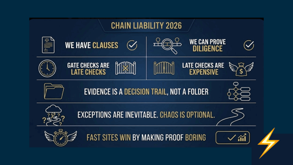 - Chain liability in 2026 pushes from ‘we have clauses’ to ‘we can prove diligence.’