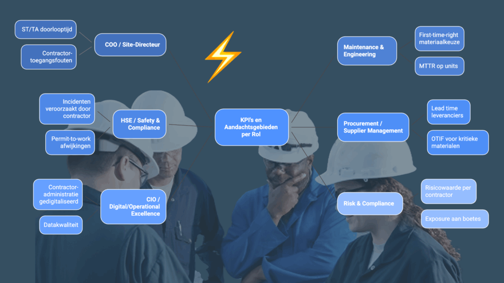 ST/TA doorlooptijd vs geplande tijd; aantal contractor-toegangsfouten dag-1; kosten van materiaalverzending / vertraging; % van contractors vooraf gekwalificeerd (incl. materiaal/chemie gebruik); audit finding score na ST/TA.